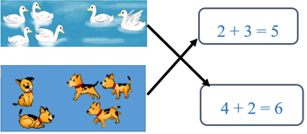 Bức tranh 1: Có 4 chú vịt thêm 2 chú vịt bơi đến, có tất cả 6 chú vịt