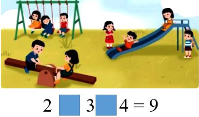 Có 2 bạn chơi bập bênh thêm 3 bạn chơi đu quay thêm 4 bạn chơi cầu trượt, vậy có tất cả 9 bạn