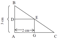 Lan có một miếng bìa hình tam giác \(ABC\) vuông tại \(A\), cạnh \(AB = 3{\rm{\;cm}}\). Lan tính rằng nếu cắt từ miếng bìa đó ra một hình chữ nhật có chiều dài \(2{\rm{\;cm}}\) như hình bên thì hình chữ nhật ấy có diện tích bằng một nửa diện tích của miếng bìa ban đầu. Tính độ dài cạnh \(AC\) của tam giác \(ABC\)