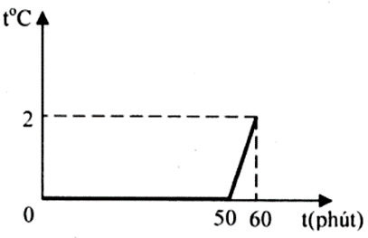 Một chậu đựng hỗn hợp nước và nước đá có khối lượng là 10 kg. Chậu để trong phòng và người ta theo dõi nhiệt độ của hỗn hợp. Đồ thị biểu thị sự phụ thuộc nhiệt độ theo thời gian cho ở hình vẽ. Nhiệt dung riêng của nước là c = 4200 J/kg.K và nhiệt nóng chảy của nước là \(\lambda = 3,{4.10^5}\;{\rm{J}}/{\rm{kg}}\). Bỏ qua nhiệt dung của chậu.
