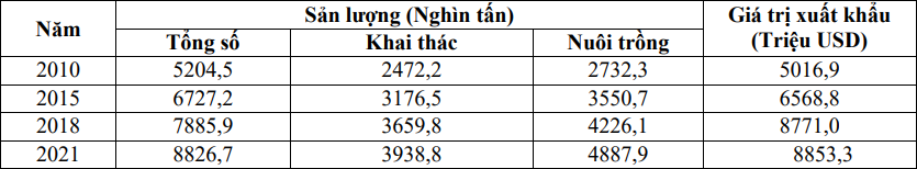SẢN LƯỢNG VÀ GIÁ TRỊ XUẤT KHẨU THỦY SẢN CỦA NƯỚC TA GIAI ĐOẠN 2010 – 2021