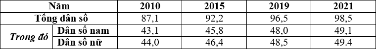 Cho bảng số liệu: DÂN SỐ PHÂN THEO GIỚI TÍNH Ở NƯỚC TA GIAI ĐOẠN 2010–2021 (Đơn vị: triệu