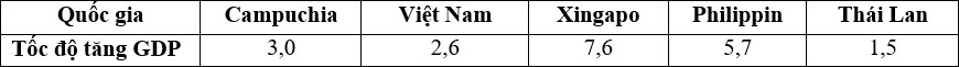 Cho bảng số liệu TỐC ĐỘ TĂNG GDP CỦA MỘT SỐ QUỐC GIA ĐÔNG NAM Á NĂM 2022 (Nguồn: Niên giám