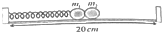 Một con lắc lò xo đặt nằm ngang gồm lò xo nhẹ có độ cứng \(k = 100\)N/m độ dài tự nhiên 10 cm một đầu gắn chặt vào tường, đầu kia gắn với vật nhỏ \({m_1}\) khối lượng 200g. Một đầu lò xo gắn chặt vào tường. Ban đầu, giữ \({m_1}\) ở vị trí lò xo nén 8 cm (trong giới hạn đàn hồi của lò xo) rồi đặt thêm vật nhỏ \({m_2}\) khối lượng cũng bằng 200g sát bên \({m_1}\) như hình vẽ. Thả nhẹ để các vật bắt đầu chuyển động không ma sát trên mặt phẳng nằm ngang. Vào thời điểm nào đó \({m_2}\) tách khỏi \({m_1}\) chuyển động đến và chạm hoàn toàn đàn hồi với tường rồi bật ngược trở lại. Cho biết 2 tường cách nhau khoảng \(L = 20cm.\) Bỏ qua kích thước của các vật nhỏ. Khoảng thời gian kể từ lúc thả vật \({m_1}\) cho đến khi hai vật va chạm với nhau lần đầu tiên có giá trị gần nhất với giá trị nào sau đây?