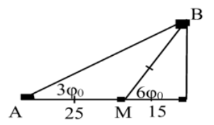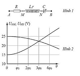 Đặt điện áp xoay chiều \(u = U\sqrt 2 \cos \omega t\) vào hai đầu đoạn mạch AB như hình vẽ, trong đó tụ điện có điện dung C thay đổi được. Đồ thị là đường biểu diễn mối liên hệ giữa điện áp hiệu dụng \({U_{AM}}\) với φ và đường biểu diễn mối liên hệ giữa điện áp \({U_{MB}}\) với φ (φ là độ lịch pha giữa điện áp u và cường độ dòng điện trong mạch). Điều chỉnh C để \(\varphi = 6{\varphi _0}\), khi đó \({U_{AM}}\) bằng bao nhiêu?