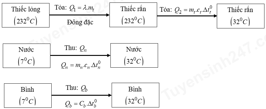 + Sử dụng các công thức: \(\left\{ \begin{array}{l}Q = \lambda m\\Q = mc\Delta t\end{array} \right.\)