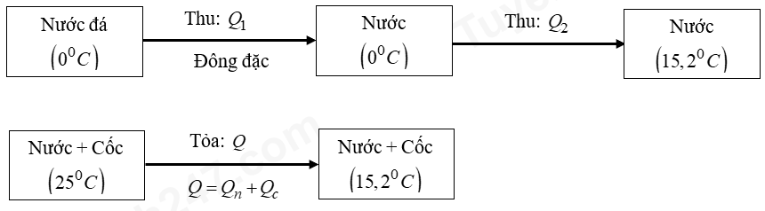 Người ta thả cục nước đá ở \({0^0}C\) vào chiếc cốc bằng đồng khối lượng 0,20