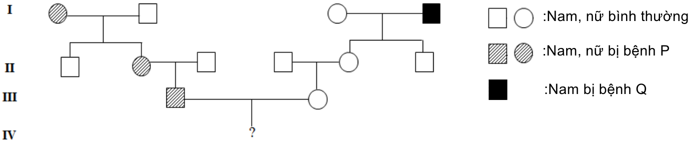 Bệnh P được quy định bởi gen trội (P) nằm trên NST thường; bệnh Q được quy định bởi gen lặn (q) nằm trên nhiễm sắc thể giưới tính X, không có alen tương ứng trên Y. Biết rằng không có đột biến mới xảy ra. Xác suất để cặp vợ chồng ở thế hệ thứ III trong sơ đồ phả hệ trên sinh con đầu lòng là con trai và mắc cả hai bệnh P và Q.
