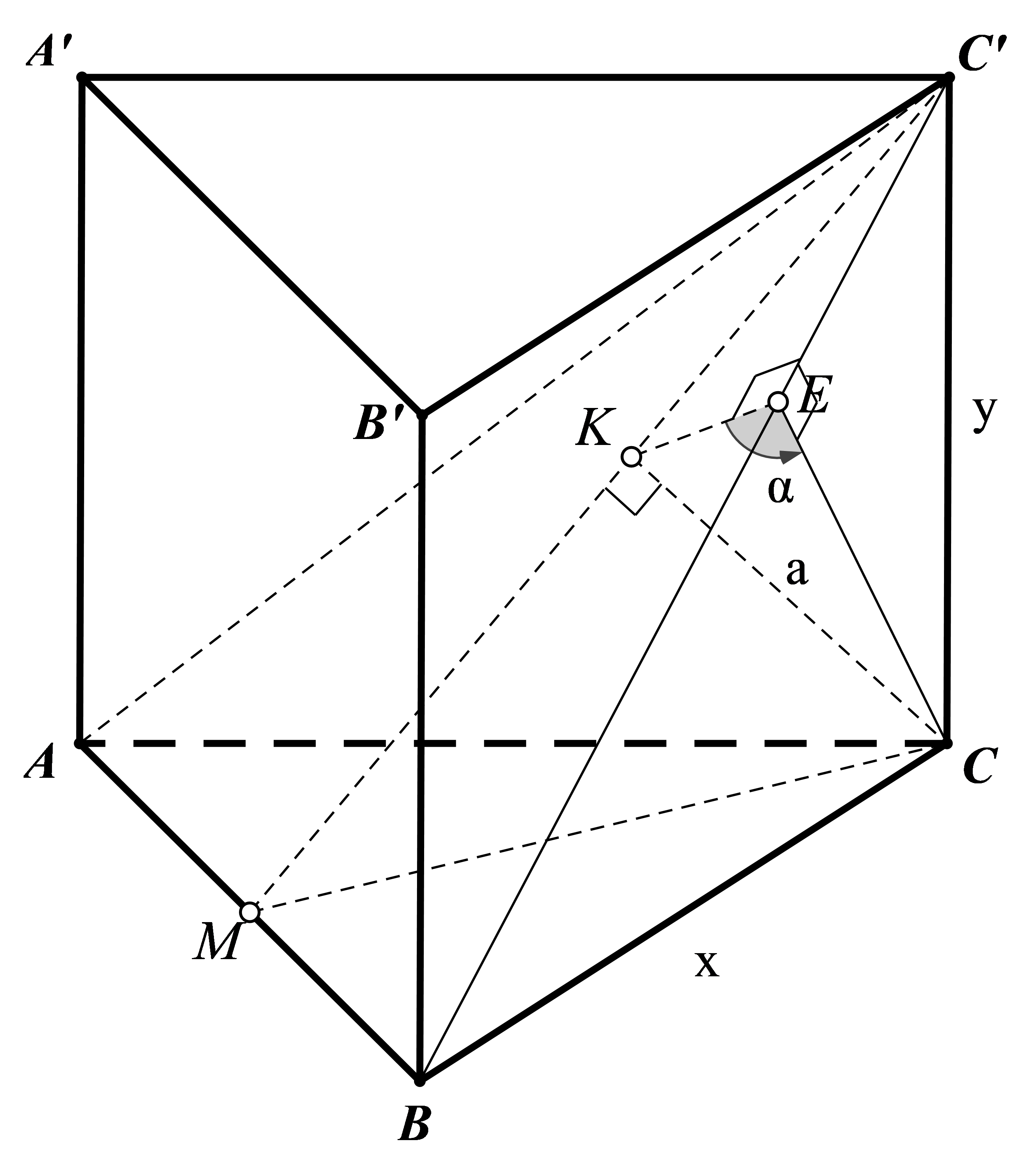 Cho hình lăng trụ đều \(ABC.A'B'C'\). Biết khoàng cách từ điểm \(C\) đến mặt phẳng \(\left( {ABC'} \right)\) bằng \(a\), góc giữa hai mặt phẳng \(\left( {ABC'} \right)\) và \(\left( {BCC'B'} \right)\) bằng \(\alpha \) với \(\cos \alpha = \dfrac{1}{{2\sqrt 3 }}\). Thể tích khối lăng trụ \(ABC.A'B'C'\) bằng