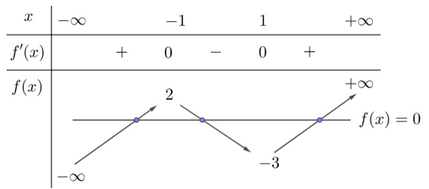 Cho hàm số \(f\left( x \right)\) có bảng biến thiên như hình vẽ. Số nghiệm của phương trình \(f\left( x \right) = 0\) là