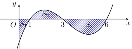 Cho hàm số \(y = f\left( x \right)\) có đồ thị như hình vẽ. Biết rằng diện tích các miền gạch chéo như hình vẽ là \({S_1} = 2,{S_2} = 3\) và \({S_3} = 5\). Tích phân bằng