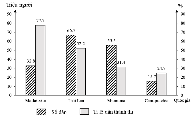 Cho biểu đồ: DÂN SỐ VÀ TỈ LỆ DÂN THÀNH THỊ CỦA MỘT SỐ QUỐC GIA NĂM 2021 (Số liệu theo
