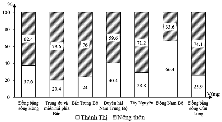Cho biểu đồ về dân số thành thị và nông thôn của các vùng ở nước ta năm 2020: