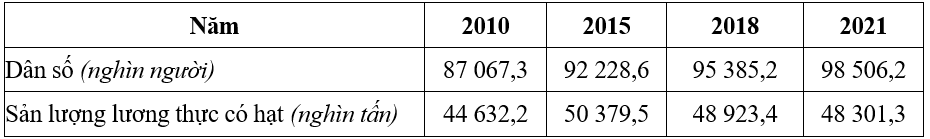 Cho bảng số liệu: DÂN SỐ VÀ SẢN LƯỢNG LƯONG THỰC CÓ HẠT CỦA NƯỚC TA GIAI ÐOẠN 2010 –