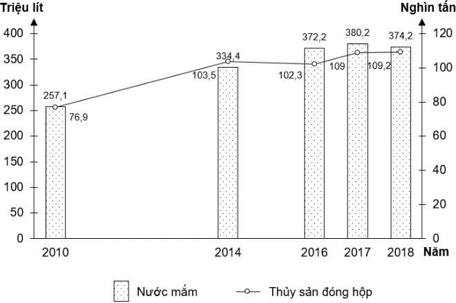 Cho biểu đồ về nước mắm và thủy sản đóng hộp của Việt Nam, giai đoạn 2010 - 2018: