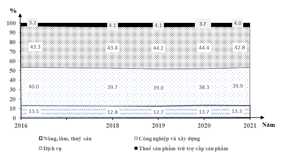 Theo biểu đồ, nhận xét nào sau đây đúng về cơ cấu GDP phân theo khu vực kinh tế của In-đô-nê-xi-a giai đoạn 2016- 2021?