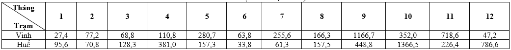Cho bảng số liệu: LƯỢNG MƯA CÁC THÁNG TẠI TRẠM QUAN TRẮC VINH VÀ HUẾ NĂM 2022 (Đơn vị: