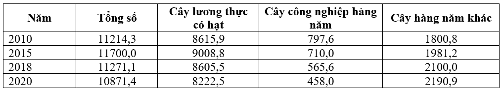 Cho bảng số liệu: DIỆN TÍCH CÁC LOẠI CÂY HÀNG NĂM CỦA NƯỚC TA, GIAI ĐOẠN 2010 - 2020 (Đơn