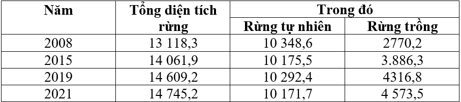 Cho bảng số liệu: DIỆN TÍCH RỪNG CỦA NƯỚC TA GIAI ĐOẠN 2008 - 2021 (Đơn vị: nghìn