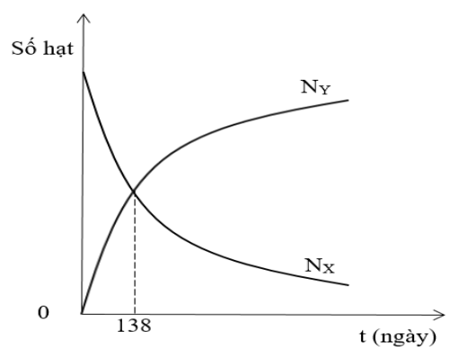 Chất phóng xạ X phân rã theo phương trình \(X \to \alpha + Y.\) Ban đầu \(\left( {t = 0} \right)\)trong mẫu hoặc chỉ chứa chất X, theo thời gian số hạt nhân chất X (kí hiệu NX) và Y (kí hiệu NY) trong mẫu quặng được biểu diễn bằng đồ thị hình vẽ bên. Gọi \({t_1}\) là thời điểm có tỉ số \(\dfrac{{{N_Y}}}{{{N_X}}} = 7.\) Giá trị của \({t_1}\) là