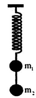 Một lò xo nhẹ có độ cứng 25 N/m, đầu trên của lò xo treo vào một điểm cố định, đầu dưới của lò xo treo hai vật \({m_1} = 100g\) và \({m_2} = 200g\) cách nhau 5cm như hình bên. Khi hệ ở vị trí cân bằng người ta đốt dây nối để vật \({m_1}\) dao động điều hòa theo phương thẳng đứng, vật \({m_2}\) rơi tự do. Bỏ qua khối lượng của dây nối \({m_1},{m_2};\) lấy \(g = 10{\rm{m/}}{{\rm{s}}^{\rm{2}}}\) và \({\pi ^2} = 10.\) Vật \({m_1}\) dao động được nửa chu kỳ đầu tiên thì khoảng cách giữa hai vật bằng