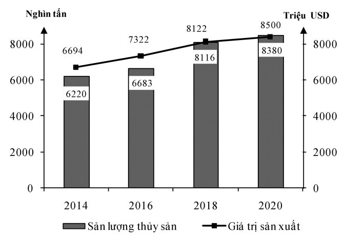 Cho biểu đồ về thủy sản nước ta giai đoạn 2014 - 2020: (Số liệu theo Niêm giám Thống kê