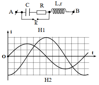 Đặt điện áp xoay chiều \(u = {U_0}\cos \left( {\omega t + \varphi } \right)\left( V \right)\)vào hai đầu đoạn mạch AB gồm tụ điện có điện dung C, điện trở thuần R và cuộn dây không thuần cảm có độ tự cảm L mắc nối tiếp như hình H1. Khi khóa k đóng và khóa k mở thì dòng điện trong mạch lần lượt là \({i_1}\) và \({i_2}\). Hình H2 là đồ thị biểu diễn sự phụ thuộc của \({i_1}\) và \({i_2}\) theo thời gian t. Biết rằng \(2R\omega C = 1.\) Khi khóa k đóng thì hệ số công suất của đoạn mạch AB có giá trị gần nhất với giá trị nào sau đây?