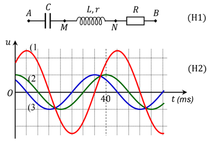 Đặt điện áp xoay chiều \({u_{AB}}\) có giá trị hiệu dụng không đổi nhưng có tần số thay đổi được vào hai đầu đoạn mạch AB như hình (H1). Biết điện dung của tụ điện, hệ số tự cảm và điện trở thuần của cuộn dây, điện trở R đều có giá trị không đổi. Hình (H2) là đồ thị biểu diễn sự biến thiên của các điện áp tức thời giữa hai đầu đoạn mạch AB đoạn mạch mạch NB theo thời gian. Điều chỉnh tần số của điện áp \({u_{AB}}\) đến giá trị \({f_0}\) thì điện áp hiệu dụng giữa hai đầu đoạn mạch AN đạt giá trị cực tiểu. Giá trị của \({f_0}\) gần nhất với giá trị nào sau đây?