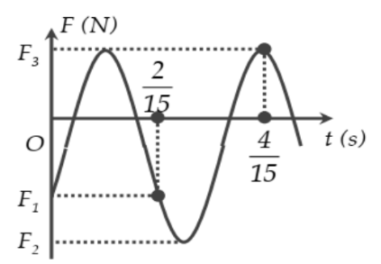 Con lắc lò xo lý tưởng gồm một lò xo có độ cứng \(k = 50{\rm{ N/m}}\) và vật nhỏ có khối lượng m được treo thẳng đứng tại nơi có gia tốc trọng trường \(g = 10\left( {{\rm{m/}}{{\rm{s}}^{\rm{2}}}} \right).\) Kích thích cho vật nặng m dao động điều hòa theo phương thẳng đứng quanh vị trí cân bằng của nó trên quỹ đạo dài 12 cm. Chọn trục tọa độ Ox có phương thẳng đứng, chiều dương hướng xuống, gốc O tại vị trí cân bằng của vật m. Gọi F (N) là giá trị đại số của lực đàn hồi do lò xo tác dụng vào vật. Đồ thị thể hiện sự biến thiên của F theo thời gian như hình vẽ. Lấy \({\pi ^2} = 10.\) Công suất tức thời của lực đàn hồi tác dụng lên vật tại thời điểm t = 0 xấp xỉ là