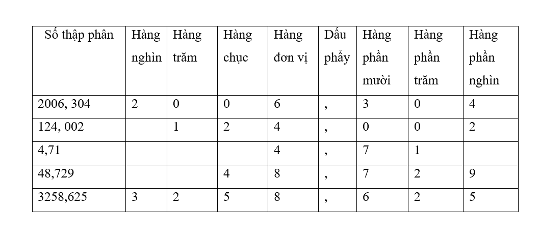 Viết mỗi chữ số của một số thập phân vào một ô trống ở “hàng” thích hợp (theo