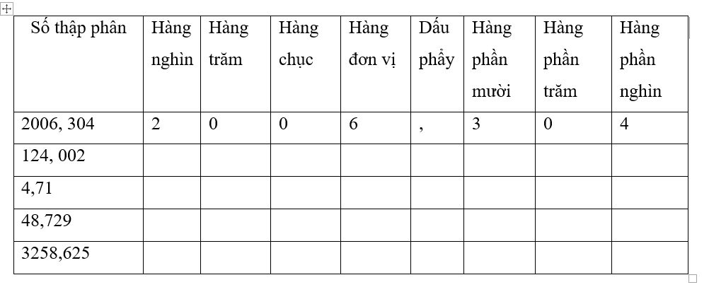Viết mỗi chữ số của một số thập phân vào một ô trống ở “hàng” thích hợp (theo mẫu):