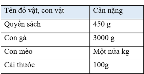 Một số đồ vật, con vật nuôi trong nhà như: quyển sách, cái cặp, chiếc mũ bảo hiểm, con mèo, ... có cân nặng như sau: