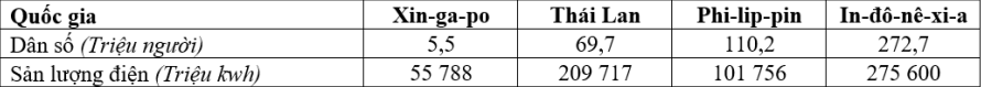 Cho bảng số liệu: DÂN SỐ VÀ SẢN LƯỢNG ĐIỆN CỦA MỘT SỐ QUỐC GIA ĐÔNG NAM Á, NĂM