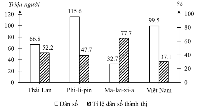 Cho biểu đồ: DÂN SỐ VÀ TỈ LỆ DÂN SỐ THÀNH THỊ CỦA MỘT SỐ QUỐC GIA ĐÔNG NAM Á, NĂM