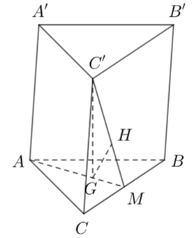 Cho khối lăng trụ \(ABC.A'B'C'\) có đáy là tam giác đều, góc giữa hai mặt phẳng \(\left( {A'B'C'} \right)\) và \(\left( {BB'C'C} \right)\) bằng \(45^\circ \), hình chiếu vuông góc của \(C'\) lên mặt phẳng \(\left( {ABC} \right)\) trùng với trọng tâm tam giác \(ABC\). Khoảng cách giữa hai đường thẳng \(AA'\) và \(BC\) bằng \(6a\). Thể tích khối lăng trụ đã cho bằng
