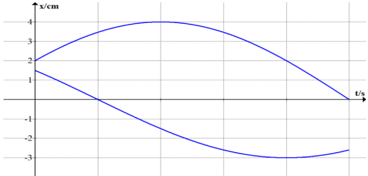 Cho đồ thị dao động của hai dao động thành phần \({x_1}\) và \({x_2}\). Biên độ của dao động tổng hợp, từ hai dao động thành phần này là