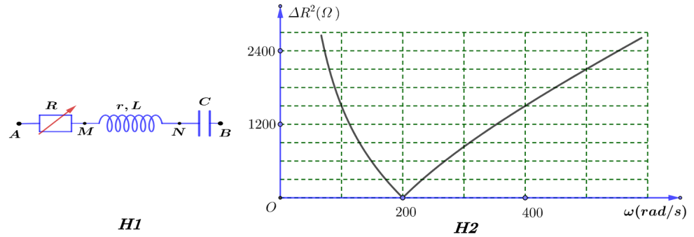 Đặt điện áp xoay chiều \(u = {U_0}\cos \left( {\omega t} \right)\) (\({U_0}\) không đổi, \(\omega \) thay đổi) vào hai đầu mạch điện như hình H1, trong đó \(r = 10\,\,\Omega \). Ứng với mỗi giá trị của \(\omega \), khi \(R = {R_1}\) thì công suất tiêu thụ trên đoạn mạch AB đạt cực đại và khi \(R = {R_2}\) thì công suất tiêu thụ trên R đạt cực đại. Hình H2 là đồ thị biểu diễn sự phụ thuộc của \(\Delta {R^2} = R_2^2 - R_1^2\) theo \(\omega \). Giá trị của L là