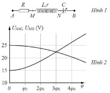 Đặt điện áp xoay chiều \(u = U\sqrt 2 \cos \omega t\) vào hai đầu đoạn mạch AB như Hình 1, trong đó tụ điện có điện dung C thay đổi được. Hình 2 là đường biểu diễn mối liên hệ giữa điện áp hiệu dụng \({U_{AM}}\) với \(\varphi \) và đường biểu diễn mối liên hệ giữa điện áp hiệu dụng \({U_{MB}}\) với \(\varphi \) (\(\varphi \) là độ lệch pha giữa điện áp u và cường độ dòng điện trong mạch). Điều chỉnh C để \(\varphi = 6{\varphi _0}\), khi đó \({U_{AM}}\) bằng bao nhiêu?
