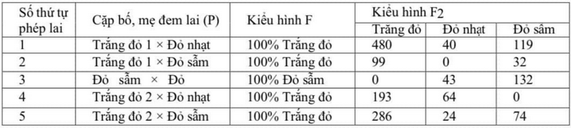 Ở một loài thực vật, có ba kiểu hình cánh hoa khác nhau: Cánh hoa trắng chấm đỏ (Trắng đỏ), cánh hoa đỏ sẫm (Đỏ sẫm) và cánh hoa đỏ nhạt (Đỏ nhạt). Có hai dòng thuần trắng đỏ khác nhau (kí hiệu là trắng đỏ 1 và trắng đỏ 2) khi tiến hành đem lại với hai dòng thuần đỏ sẫm và đỗ nhạt thu được kết quả như sau: