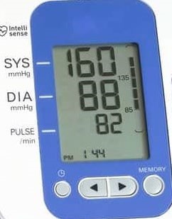 Khi đo huyết áp bằng huyết áp kế điện tử, bác An thu được kết quả trên máy như hình bên.