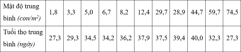 Khi nghiên cứu về ảnh hưởng của mật độ ruồi giấm lên tuổi thọ của chúng, người ta thu được bảng số liệu sau: