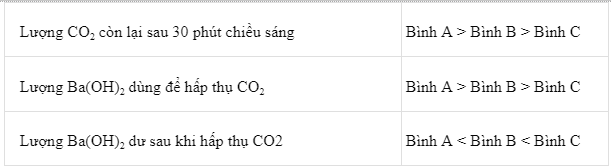 Một học sinh đã thực hiện một thí nghiệm như sau: chuẩn bị 3 bình thủy tinh có nút kín A, B và C. Bình B và C có treo hai cành cây có diện tích lá lần lượt là 40cm2 và 60cm2. Bình B và C chiếu sáng trong 30 phút. Sau đó lấy các cành cây ra và cho vào các bình A, B và C mỗi bình một lượng Ba(OH)2 như nhau, lắc đều sao cho khí CO2 trong bình hấp thụ hết. Trong số các phát biểu sau, có bao nhiêu phát biểu đúng?