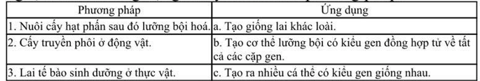 Trong số các tổ hợp ghép đôi giữa phương pháp tạo giống và và ứng dụng của nó sau đây, tổ hợp nào đúng?