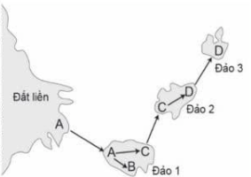 Hình bên mô tả các đảo đại dương xuất hiện gần như cùng một thời điểm. Các chữ cái A, B, C, D là tên các loài được hình thành bằng con đường cách li địa lí, các mũi tên chỉ hướng di cư hoặc hướng hình thành loài từ loài này sang loài kia. Trong số các nhận xét được cho dưới đây, có bao nhiêu nhận xét đúng?