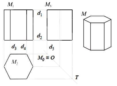 c) Nêu cách xác định điểm M3 biểu diễn đỉnh M của đáy trên của lăng trụ khi biết \({M_1}\) và \({M_2}\) biểu diễn M trong hình chiếu đứng và hình chiếu bằng.