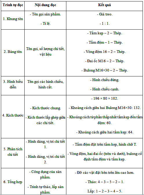 Đọc bản vẽ lắp giá treo ở Hình 56 và ghi lại kết quả đọc theo bảng dưới đây.