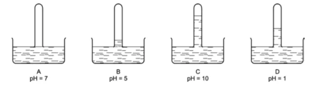 Cho bốn chất khí được đưa vào đầy 4 ống nghiệm được đánh kí hiệu (A), (B), (C), (D). Sau đó úp ngược 4 ống nghiệm vào 4 chậu nước. Biết điều kiện thực hành thí nghiệm là như nhau. Kết quả được cho dưới hình vẽ sau: