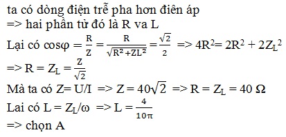 Đoạn mạch xoay chiều gồm hai trong 3 phần tử R, L, C mắc nối tiếp . Biết hiệu điện thế tức thời đặt vào hai đầu đoạn mạch u = 160cos(100πt)(V) và cường độ dòng điện tức thời qua mạch i = 2