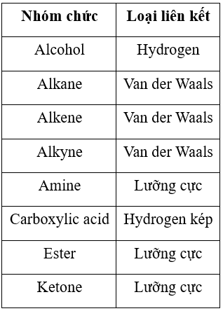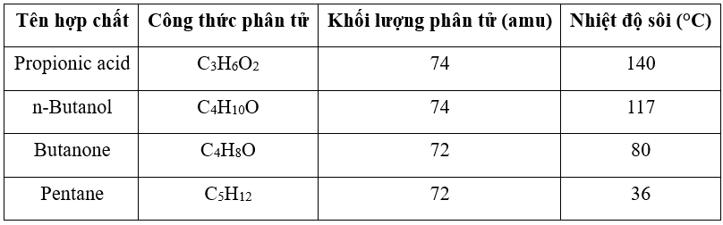 Bảng 2 liệt kê các đặc điểm của bốn hợp chất hữu cơ phổ biến có khối lượng phân tử giống nhau. Nhiệt độ sôi dưới đây đại diện cho điểm sôi thông thường của mỗi chất.