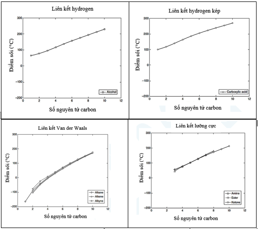 Hình 2 dưới đây so sánh các điểm sôi thông thường của các hợp chất hữu cơ với tám nhóm chức khác nhau (bao gồm cả nhóm alkane) có số nguyên tử C trong phân tử tăng dần.